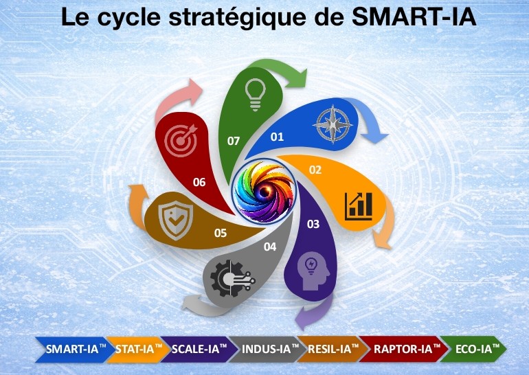 PARIS-SMART structure l’intelligence artificielle comme un cycle continu : gouvernance, transformation, industrialisation et vigilance. L’objectif est de rendre l’IA exploitable, sécurisée et pilotable dans le temps — du COMEX jusqu’au run.